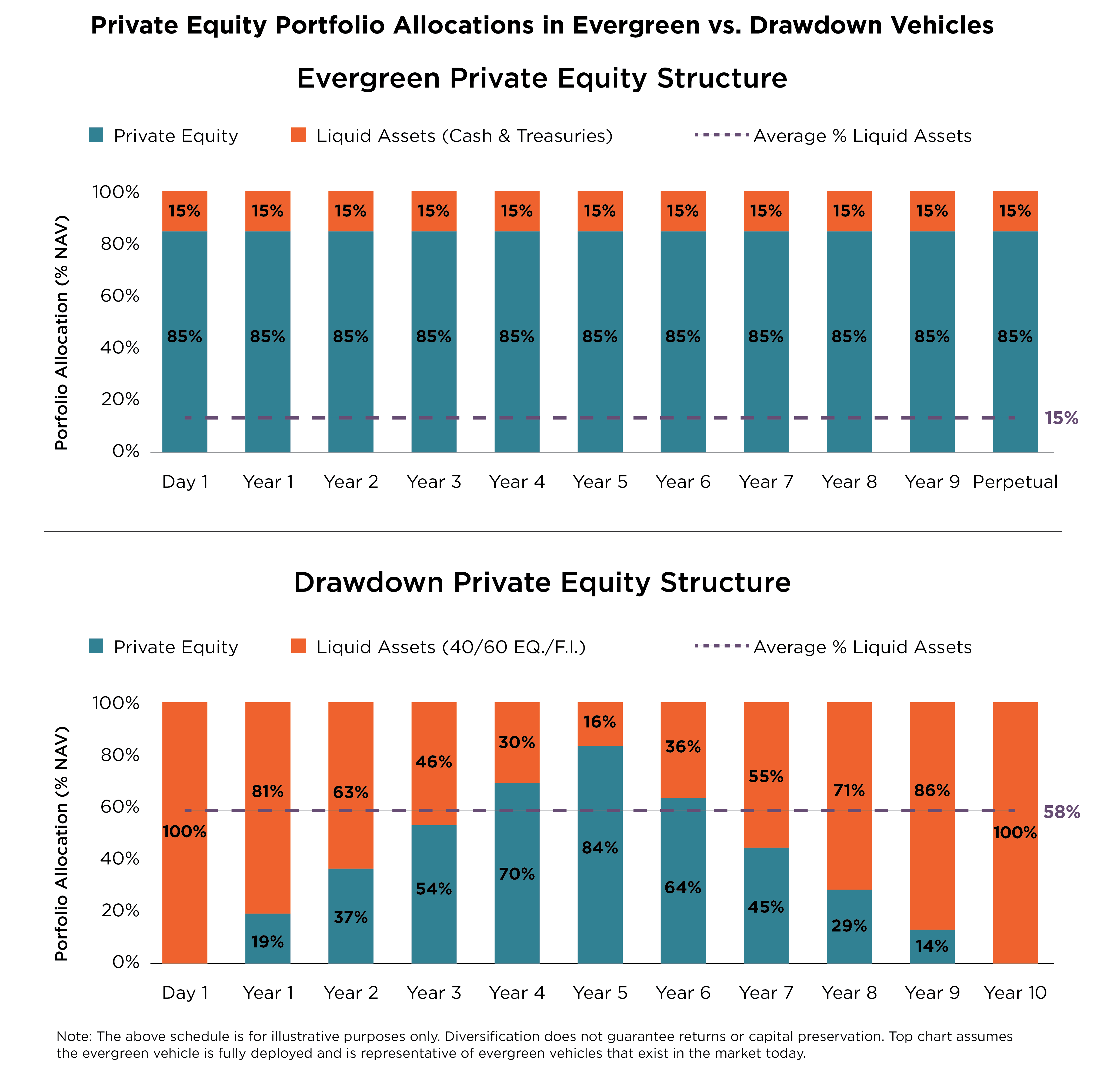 Efficient Capital Deployment: Unlike traditional “drawdown” PE models, where capital often remains idle for extended periods, evergreen funds put investor capital to work from day one. The contrast is shown in the chart below, with the blue portion denoting “actively deployed capital” - in other words, genuine “private equity”.